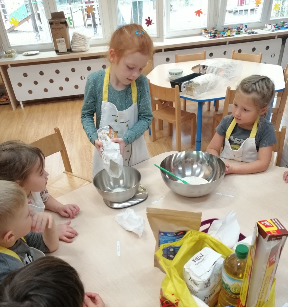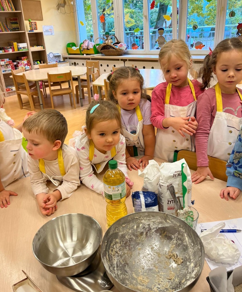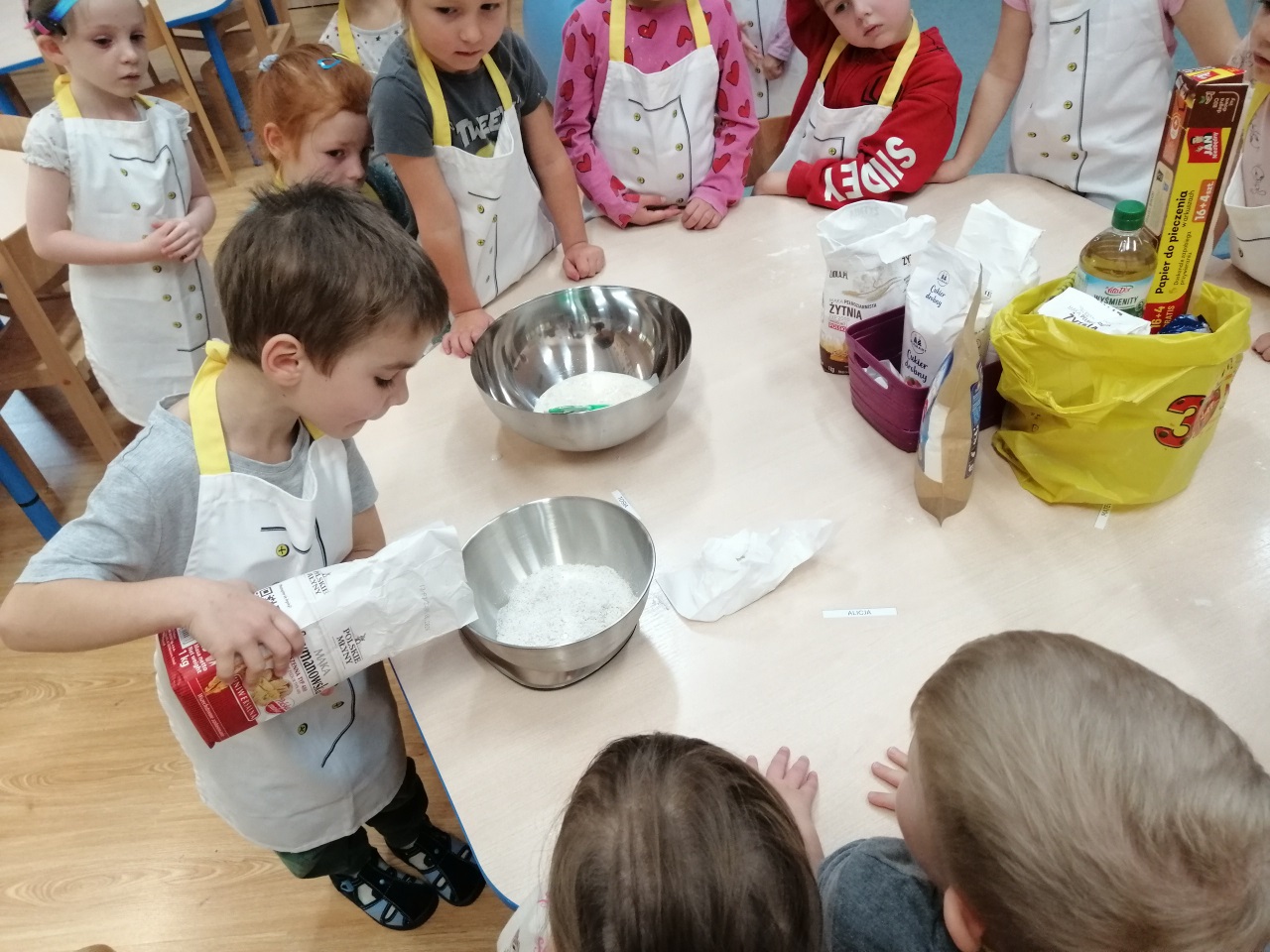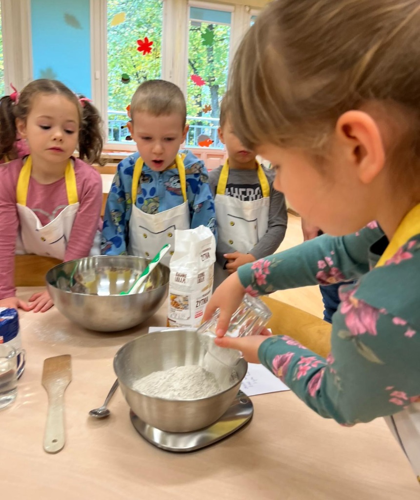 Pod okiem nauczycieli dzieci odmierzały składniki na wadze kuchennej, wsypywały je do miski, mieszały i wyrabiały chleb. Gotowe ciasto zostało przekazane do kuchni, gdzie panie kucharki zajęły się jego wypiekiem.