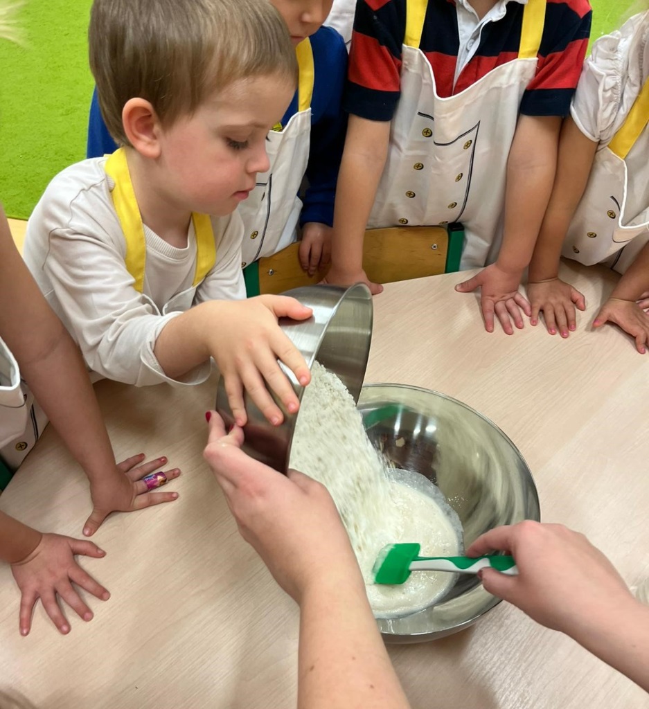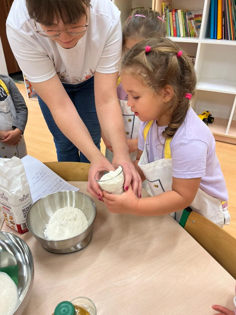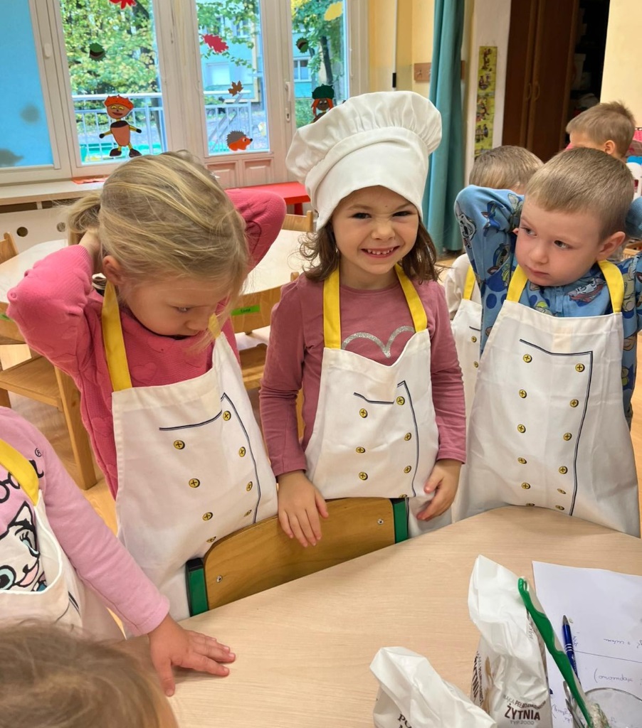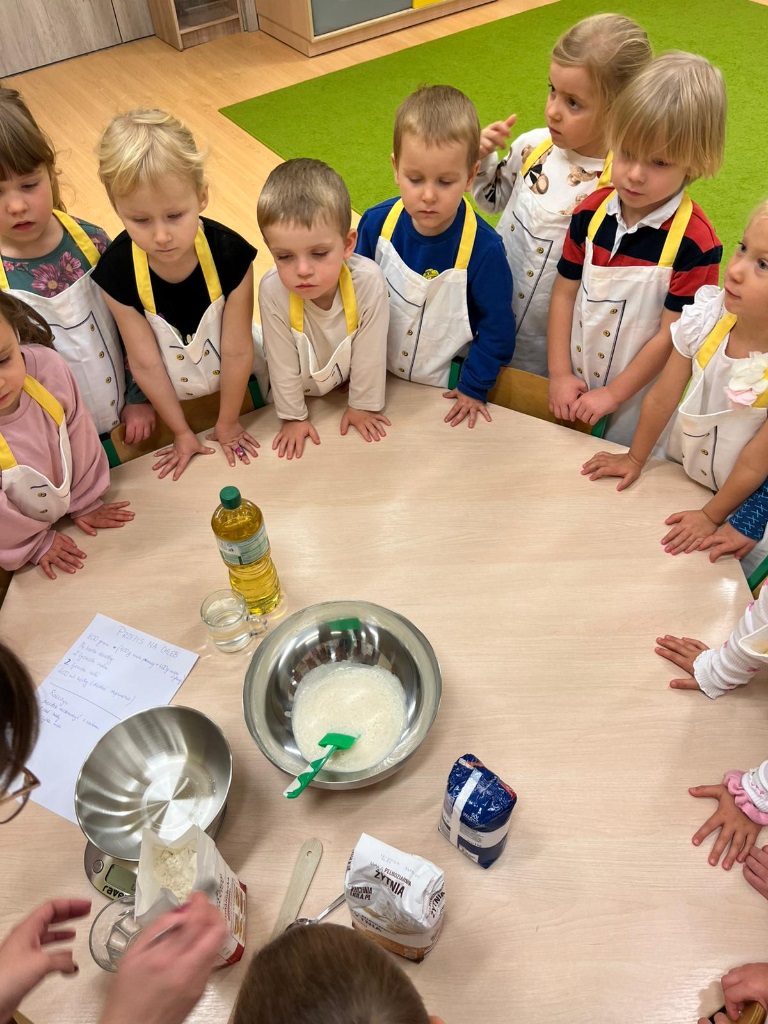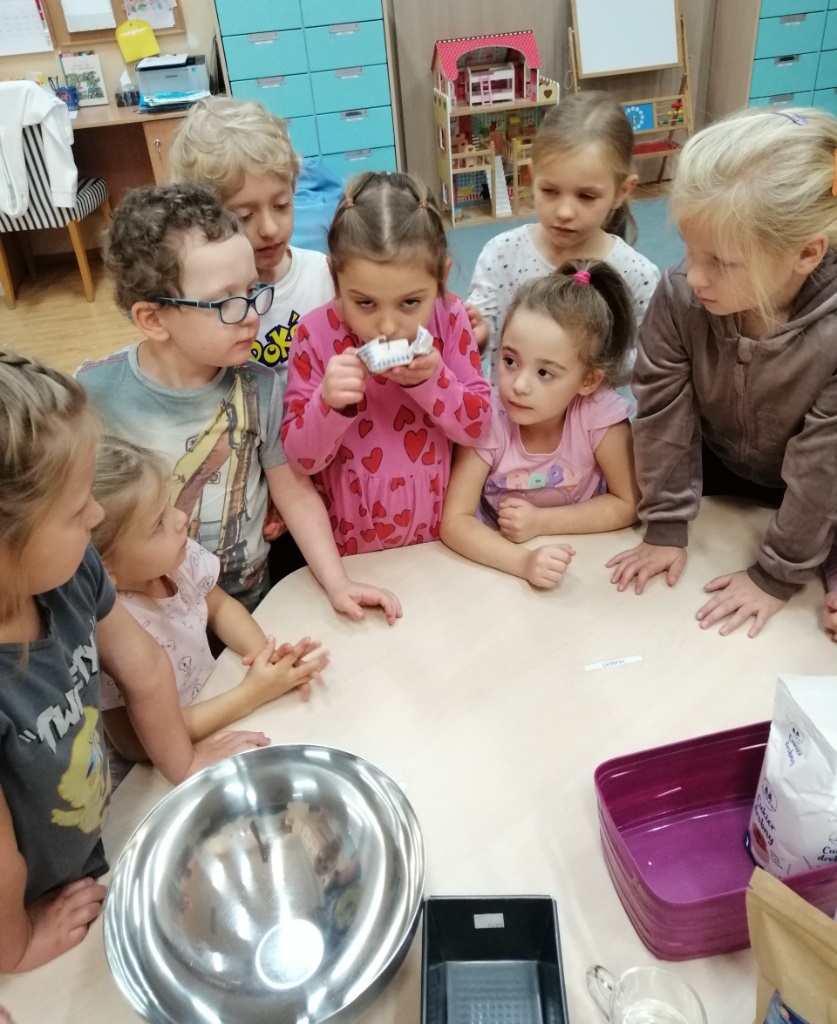 Pod okiem nauczycieli dzieci odmierzały składniki na wadze kuchennej, wsypywały je do miski, mieszały i wyrabiały chleb. Gotowe ciasto zostało przekazane do kuchni, gdzie panie kucharki zajęły się jego wypiekiem.