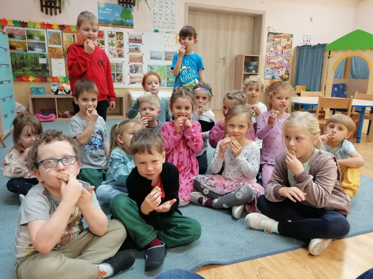 Wspólne pieczenie okazało się dla przedszkolaków nie tylko ciekawą lekcją, ale też niezwykłym doświadczeniem zmysłowym. Zapach świeżo upieczonego chleba wypełnił salę, a dzieci z dumą i apetytem próbowały swojego wypieku.