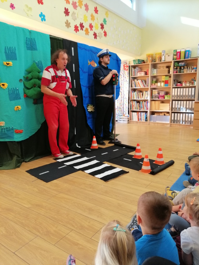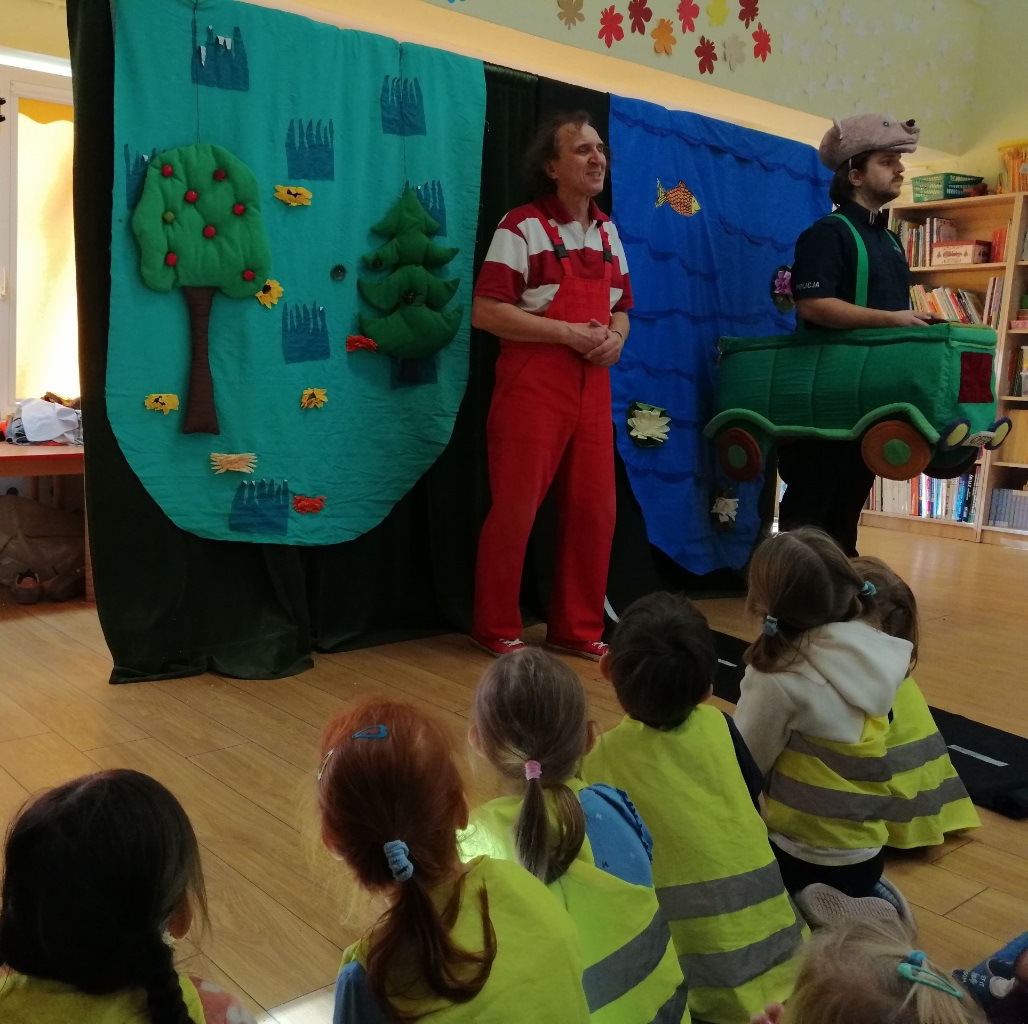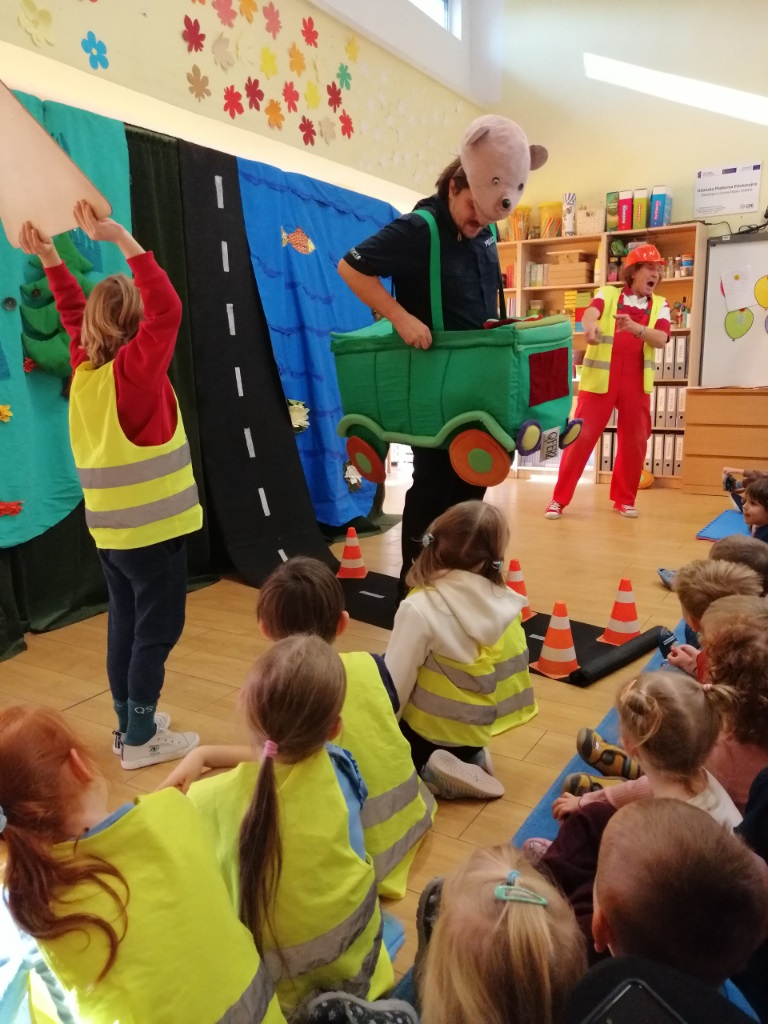 Przedszkolaki chętnie śpiewały piosenki o zasadach ruchu drogowego, które łatwo wpadały w ucho i pomagały utrwalić poznane treści. Przedstawienie dostarczyło dzieciom wielu wrażeń i w atrakcyjnej formie przypomniało, jak ważne jest bezpieczeństwo na drodze.